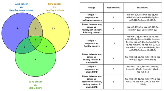 Additionally, lung cancer participants compared to the healthy smoker’s cohort identified 14 significantly over- and 12 significantly under-expressed miRNAs.