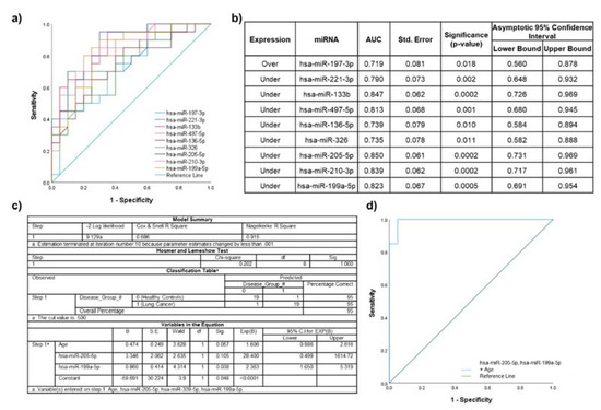 Discriminatory power assessed using ROC curves for the miRNAs that were significantly dysregulated in lung cancer participants compared to healthy non-smoker participants. (a) Individual ROC curves for under- and overexpressed miRNAs; (b) AUC values, including standard error (Std. Error), significance and 95% confidence intervals; (c) binary logistic regression model for miR-205-5p, miR-199a-5p, and significant clinical characteristic (age); (d) ROC curve for the logistic regression model.