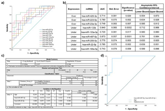 Discriminatory power assessed using ROC curves for the miRNAs that were significantly dysregulated in lung cancer participants compared to healthy smokers. (a) Individual ROC curves for under- and overexpressed miRNAs; (b) AUC values, including standard error (Std. Error), significance and 95% confidence intervals; (c) binary logistic regression model for miR-497-5p, miR-22-5p and significant clinical characteristics (age); and (d) ROC curve for the logistic regression model.