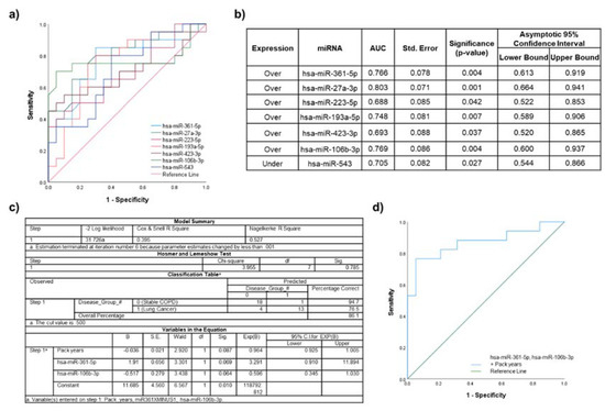 Discriminatory power assessed using ROC curves for the miRNAs that were significantly dysregulated in lung cancer participants compared to stable COPD participants. (a) Individual ROC curves for under- and overexpressed miRNAs; (b) AUC values, including standard error (Std. Error), significance, and 95% confidence intervals; (c) binary logistic regression model for miR-106b-3p and miR-361-5p, as well as significant clinical characteristic (pack years); and (d) ROC curve for the logistic regression model.