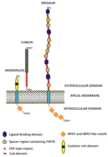 Megalin, cubilin and amnionless present known domains and motifs. Megalin binds a variety of filtered proteins through its complement type repeats and is able to internalize ligands via NPXY motifs in the cytoplasmic tail. Cubilin contains multiple binding domains (CUB domains) and epidermal growth-factor-type (EGF-type) repeats, as a peripheral membrane protein depends on megalin and/or AMN. AMN contains an NPXY motif and probably assists cubilin in endocytosis as well as in intracellular transport during synthesis.