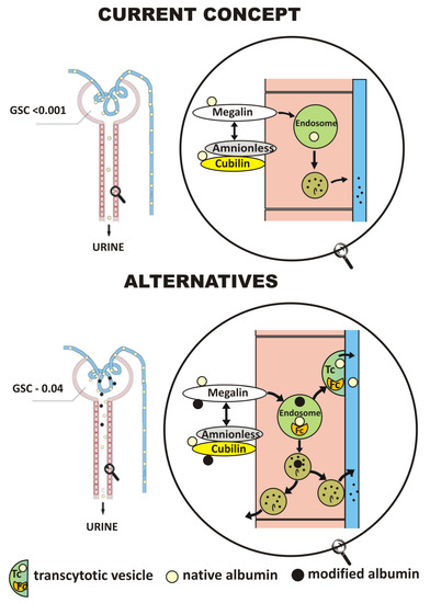 Renal catabolism of albumin—current concepts and alternatives. The generally accepted model assumes a relatively low level of glomerular albumin filtration due to its relatively large size and low isoelectric point, efficient reabsorption by endocytosis, involving megalin and cubilin-amnionless complex, vesicular transport to lysosomes and hydrolysis to single amino acid residues. In this model, only a negligible amount of albumin is excreted in urine, and the degradation products mostly return to circulation. The controversies concern both the quantitative and qualitative aspects of this process. New studies indicate, inter alia, that albumin permeation can occur with a GSC of 0.04. In the proposed model, native molecules undergo mainly transcytosis, while structurally modified molecules, i.e., oxidized or glycated, follow the classical path, with lysosomal degradation taking place to a limited extent. Most degradation products are short polypeptides that are secreted into the lumen of the tubule.