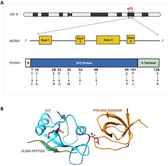 Schematic representation of SH2D1A gene with some missense mutations and the SAP protein structure. (A) The SAP gene and the corresponding protein are represented, showing an N-terminal (pink) region encoded by the exon 1, a central SH2 region (blue), encoded by exons 1,2 and 3 and a C-terminal region (light green) encoded both by exon 3 and 4 (exons are represented in yellow and indicated with a number in squares). Ten missense mutations on SAP SH2 and C-terminal domains affecting protein stability (Y7C, V10G, S28R, Q99P, P101L, X128R), and binding ability to both phosphorylated (R32Q, C42W) and unphosphorylated (R32Q, C42W, T53I, T68I) forms of SLAM are shown. (B) The 3D structure of SAP (light blue), in a trimeric complex with SLAM-PEPTIDE (green) and the SH3 domain of Fyn (orange) is showed [27]. The two arginine residues in positions 32 and 78, are shown (red) which are reported to play a critical role in the binding with SLAM and Fyn, respectively.
