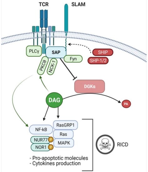 SAP signalling and DGKα inhibition. Upon TCR stimulation, the adaptor protein SAP binds to ITSMs sequences on the cytoplasmic tail of the SLAM-family and other receptors, competing with SHIP and SHP-1/2 phosphatases and promoting activator signals. At the membrane, SAP interacts with different binding partners, such as the FYN Kinase, PKCθ and NCK1, involved in T-cell activation. Moreover, SAP mediates the inhibition of DGKα, resulting in an accumulation of PLCγ-derived DAG, leading to MAPK pathway activation, pro-apoptotic molecules expression and cytokines production. Furthermore, the increased levels of DAG enhance PKCθ activity resulting in signalling which potentiates NFκB activation. In antigen-experienced CD8+ cells, these events trigger the RICD program, which promotes effector T-cells clearance and prevents excessive lymphoproliferation.