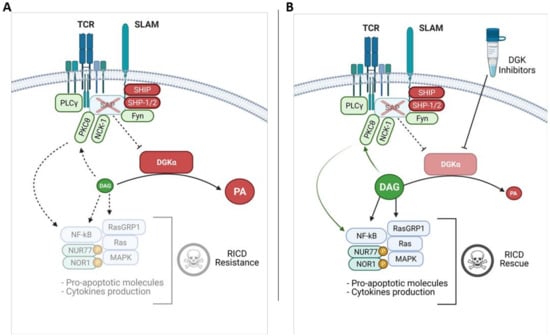 Reduced DAG signalling in XLP-1 and effects of DGK inhibitors. (A) In XLP-1 lymphocytes, the absence of SAP allows the binding of SHIP or SHP-1/2 phosphatases to SLAM family receptor ITSMs, promoting the transduction of inhibitory signals which attenuate the TCR signaling strength. In SAP-deficient conditions, DGKα shows increased activity and metabolizes DAG, contributing to RICD resistance. (B) This defect can be rescued by treating the cells with DGKα inhibitors which restore DAG signalling. DAG mediated PKCθ and MAPK activation leads to NUR77/NOR1 expression and phosphorylation, promoting RICD.