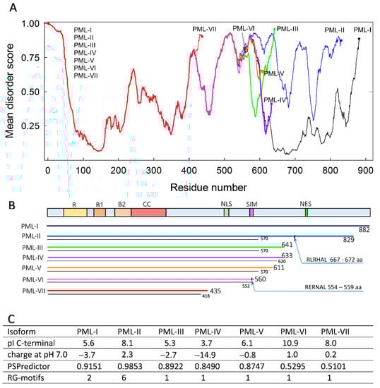 Schematic presentation of different alternatively spliced isoforms of human PML protein. (A) Mean disorder score. Disorder score determined by s(MDP), IUP2(S), IUP2(L), VLXT, VL3, VSL2B, PONDR-FIT algorithms are presented in Figure 1. (B) The generalized domain structure, indicating positions of the Ring domain (R—amino-acid residues 45–105), Box 1 (B1—residues 124–166), Box 2 (B2—residues 184–230), Coil-coil (CC—residues 229–323), Positions of the nuclear localization signal (NLS—residues 476–490), SUMO-interacting motif (SIM—residues 556–562) and nuclear export signal (NES—residues ~704–713, exclusive to isoform I). Double lines show the length of each isoform (colored line) and the length of the fragment in which the amino acid residues are the same in PML-I isoforms. Arrows indicate the position of membrane binding domains (667–672 a.a. in PML-II and 554 a.a. in PML-VI). (C) Different characteristics of PML-isoforms: pI of C-terminal domain, the charge of protein at pH 7.0, the result of LLPS prediction analysis, the content of RG-motifs in amino acid sequence.