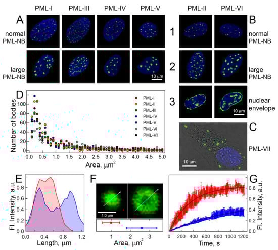 Localization, shape, size distribution, and dynamic properties of PML bodies visualized by various exogenous EGFP-PML isoforms in the presence of all endogenous forms of PML protein in U2OS cells. Nuclear localization of normal, small (area < 1.5 μm2, row 1) and large (area > 1.75 μm2, row 2) PML-bodies with exogenous PML isoforms I, III, IV, and V (A) and PML isoforms II and VI (B). Row 3 (B)—Migration of exogenous PML-II and PML-VI to the nuclear lamina. (C) cytoplasmic localization of PML bodies visualized by exogenous GFP-PML VII. (D) Distribution of different PML bodies by size. In all figures representing images of PML bodies, the scale bar is 10 μm. The nuclei are colored with DAPI. (E) Radial distribution of EGFP fluorescence intensity for small spherical (<1.5 μm2; red) and large toroidal (>1.75 μm2; blue) PML-bodies. (F) Micrographs of small spherical and large toroidal PML-bodies. The red and blue lines at the bottom show the body sizes measured by the EGFP fluorescence recovery curves (FRAP) shown in (G). (G) FRAP curves after photobleaching of nuclear PML isoforms in PML bodies. Photoreduction curves of PML isoforms in small and large PML-bodies are shown in red and blue. The approximation of FRAP data within the mono-exponential approximation is shown by solid black curves. The initial fluorescence for all bodies before photobleaching is taken as unity.