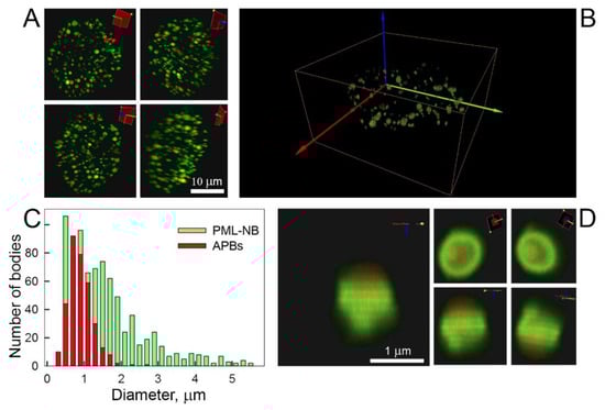 PML-bodies associated with alternative telomere lengthening (APBs). (A) Image of APBs with co-expressed by EGFP-PML-III and TagRFP-TRF1 using confocal fluorescence microscopy. Presented by APB in four angles. (B) 3D-structure of APBs with co-expressed by EGFP-PML-III and TagRFP-TRF1 using confocal fluorescence microscopy (see Video in Figure S2, Panel B). (C) Size distribution of PML-bodies colocalized with TRF1 in U2OS cells. (D) Visualization using fluorescence confocal microscopy of EGFP and TagRFP of the distribution of PML and TRF1 with coexpression of EGFP-PML-III and TagRFP-TRFP1 in U2OS cells (see Video in Figure S2, Panel B).
