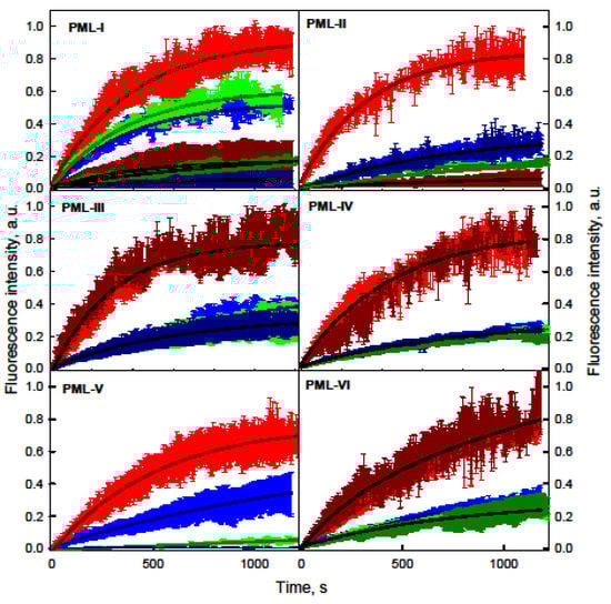 The acute oxidative stress action on the dynamics of exchange of PML isoforms with nucleoplasm in U2OS cells. The red, blue, and green curves are similar to those in Figure 4. Dark red indicates the curves of photoreduction of PML isoforms in the composition of “small” PML- bodies in the presence of 500 μM H2O2, dark blue indicates the curves of photoreduction of PML isoforms in the composition of “large” PML bodies in the presence of 500 μM H2O2, dark green—curves of photoreduction of PML isoforms in APBs in the presence of 500 μM H2O2. Solid curves represent the approximation of FRAP data in the framework of the mono-exponential approximation. The standard deviation of the data is passed by error bars of the corresponding color.