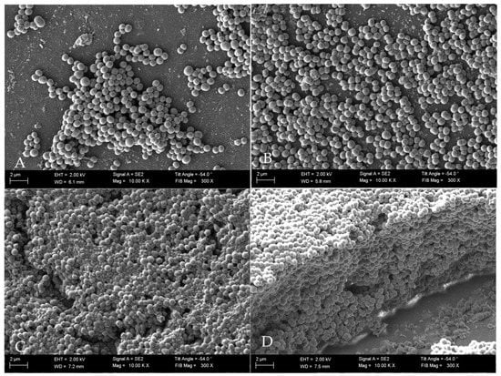 L929 fibroblast monolayer, S. aureus biofilm, and co-culture of these cell types at the chosen stage of culture were fixed in 2.5% glutarate aldehyde (Carl Roth, Karlsruhe, Germany) for 24 h at 4 °C. Then, the samples were rinsed three times with a cacodyl buffer to remove any residual of the fixative agent. The dehydration process was conducted with increasing concentrations of ethanol (30, 60, 80, 90, and 100%). The obtained samples were dried at room temperature for 15 min and coated with a 15 nm layer of carbon using a high vacuum carbon coater (ACE 600, Leica, Germany) and imaged with the ZEISS Auriga 60 scanning electron microscope (Zeiss, Germany).