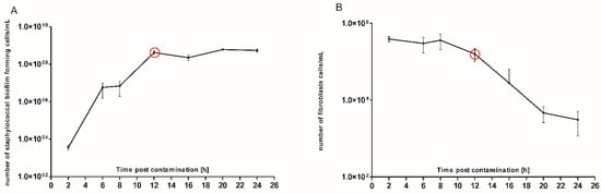 After each time of incubation of S. aureus biofilm culture and co-culture with fibroblast cells, biofilm with medium from the bottom of the wells was collected to tubes and vigorously shaken on vortex mixing for 3 min to release single cells. The Miles and Misra method was applied to determine the number of colony-forming units. The obtained bacterial suspensions were diluted 101–107 times. TSA (Trypticase Soy Agar, Biomaxima, Lublin, Poland) plates were divided into eight equal sectors and labeled with the dilution factor. Then, ten µL in three repeats of each dilution was dropped onto the appropriate sector of the agar surface. The plates were incubated at 37 °C for 24 h. After incubation, the microbial colonies were counted and the number of cells forming a biofilm on polystyrene and monolayer of fibroblasts was calculated.