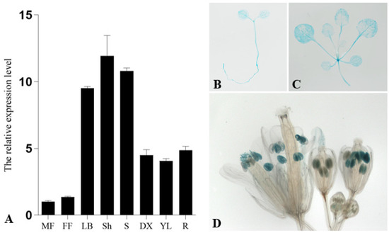 Spatiotemporal expression patterns of PsnCYCD1;1 gene. (A) The relative expression level of PsnCYCD1;1 gene in different tissues of P. simonii × P. nigra. MF: male flowers; FF: female flowers; LB: leaf buds; Sh: shoots; S: stems; DX: differentiating xylems; YL: young leaves; R: roots. Histochemical analysis of the GUS activity during different developmental stages of the ProPsnCYCD1;1::GUS transgenic Arabidopsis. GUS staining was observed in the 7-day old seedlings (B), three-weeks old seedlings (C), and the mature anthers in flowers (D).