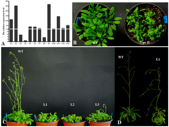 In order to observe the growth process of transgenic Arabidopsis, the seedlings were transplanted into the soil medium. The rosette leaves of wild-type plants were fully expanded, while the transgenic plants’ leaves were highly curled. Although the number of rosette leaves was not different from that of wild-type plants, the plant growth was weak (Figure 3B). After 1.5 months, the wild-type plants began to grow inflorescence meristems, while the transgenic plants were still in a vegetative growth state (Figure 3C). After continuous cultivation in long-day conditions for about 2 weeks, the inflorescences began to appear and the flowering time of each transgenic seedling was different. Moreover, the inflorescences were bent and they could not grow upright without artificial assistance (Figure 3D). The transgenic plants could also blossom and produce seeds normally, but the seed setting rate was very low.