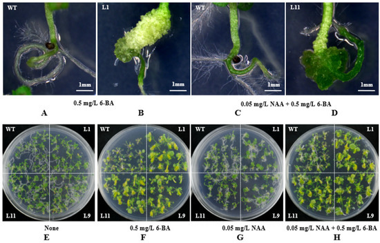 Response of transgenic seedlings to different hormones. (A,B) Enlarged view of wild-type and transgenic lines on MS medium containing 0.5 mg/L 6-BA. (C,D) Enlarged view of wild-type and transgenic lines on MS medium containing 0.05 mg/L NAA and 0.5 mg/L 6-BA. (E) MS medium without hormones. (F) MS medium containing 0.5 mg/L 6-BA. (G) MS medium containing 0.05 mg/L NAA. (H) MS medium containing 0.05 mg/L NAA and 0.5 mg/L 6-BA. WT, wild-type Arabidopsis seedlings; L1/9/11, three individual transgenic seedlings.