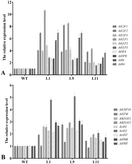 Compared with the WT, AtAS2 was upregulated more than two-fold in both Type I and Type II, and the highest expression level was up to five-fold. AtKNAT1, AtKNAT2, AtAS1, AtANT, AtPHB, and AtPHV were upregulated more than two times in Type II, but only 1.5 times in Type I. AtEXP10 gene was upregulated more than two times in only one Type II transgenic line and 1.5–2.0 times in other samples. In addition, the expression level of AtSTM showed no significant difference in all the tested samples (Figure 6B).