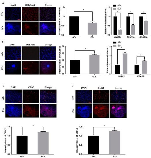 We first cultured and transferred AFs to the enucleated oocytes to obtain cloned day-8 blastocysts. Thereafter, we removed the zona pellucida with acid Tyrode’s solution and placed 2–3 blastocysts per culture insert in 8-well IbiTreat µ-plates (Ibidi GmbH; Martinsried, Germany) with ECs culture media at 37 °C with 5% CO2. Epigenetic dynamics play an important role in embryonic genome activation and preimplantation embryonic development. We identified that H3K9me2 expression in AFs was significantly higher than that in the ECs, which indicates transcriptional repression in the AFs (Figure 1A). We also analyzed H3K56ac expression in AF and ECs and observed that H3K56ac is highly expressed in the ECs (Figure 1B). As H3K56ac is involved in the cell cycle, we also analyzed the expression levels of cyclin dependent kinase 2 (CDK2) and 4 (CKD4) (Figure 1C,D). The results showed that the expression level of both cell cycle-related proteins was significantly higher in ECs than in AFs. These results suggest that ECs are favorable for reprogramming enucleated oocytes.