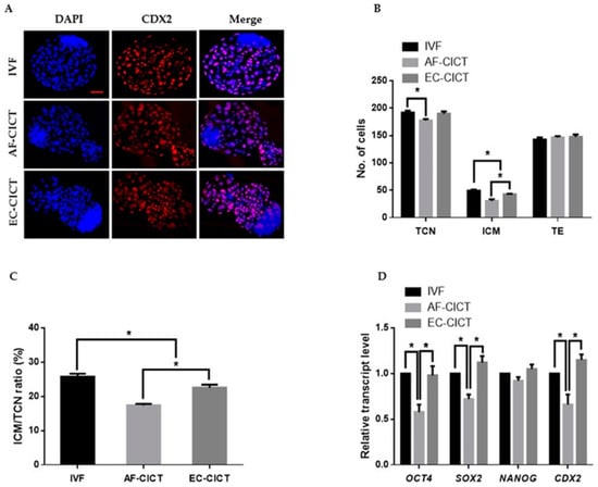 After characterizing the donor cells, the ECs were collected from the culture plate and transferred to enucleated oocytes using CICT. The EC-CICT blastocysts had significantly higher CDX2 positive cells than the AF-CICT blastocysts (Figure 2A); however, there was no significant difference in the number of CDX2 positive cells between EC-CICT and normal IVF blastocysts. Furthermore, the fusion and cleavage rates were similar between AF-CICT and EC-CICT (p > 0.05, Table 1). The percentage of EC-CICT 8–16 cell embryos and blastocysts (68.6 ± 1.7 and 32.8 ± 0.8%, respectively) was significantly greater (p < 0.05) than that of AF-CICT 8–16 cell embryos and blastocysts (61.9 ± 3.1 and 29.4 ± 1.2%, respectively) and significantly lower (p < 0.05) than that of IVF 8–16 cell embryos and blastocysts (77.3 ± 0.9 and 36.6 ± 0.4%, respectively). Further, the total number of cells (TCN), ICM, and trophectoderm (TE) cells was significantly different (Figure 2B; Table S2). By comparing the ICM and TCN ratios, we found that AF-CICT blastocysts had significantly lower ICM than IVF and EC-CICT blastocysts (Figure 2C). To further confirm this, we analyzed the ICM-related genes, such as OCT4, NANOG, and SOX2, and found that their expression was not significantly different between the IVF and EC-CICT blastocysts (Figure 2D). The above results suggest that donor cells significantly affect the embryos cloned using CICT.