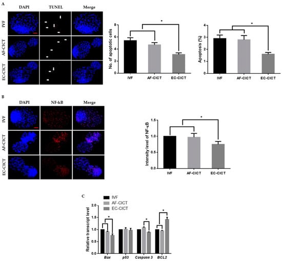Incidence of apoptosis in blastocysts. (A) Terminal deoxynucleotidyl transferase dUTP nick end-labeling (TUNEL) assay of blastocysts. Embryos were stained for TUNEL (red, white arrow) and DNA (DAPI, blue). Bar = 100 µm. Quantification of the number and proportion of apoptotic cells (n = 10 per group). (B) Representative immunofluorescence images of NF-κB in CICT embryos at the blastocyst stage. Embryos were stained for NF-κB (red) and DNA (DAPI, blue). Bar = 100 µm. Quantification of fluorescence intensity at the blastocyst stage (n = 10 per group). (C) RT-qPCR results for apoptosis-related genes in blastocysts (n = 5 per group). Labeling intensity was expressed relative to that of the IVF group (set as 100%). The data are from three independent experiments and are means ± SEM (* p < 0.05).
