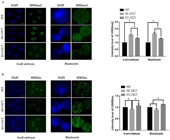 Global methylation levels of H3K9 and acetylation levels of H3K56 in IVF and CICT embryos. (A) Representative immunofluorescence images of H3K9me2 in embryos at the four-cell and blastocyst stage. Embryos were stained for H3K9me2 (green) and DNA (DAPI, blue). Bar = 100 µm. Quantification of fluorescence intensity at the four-cell and blastocyst stage (n = 10 per group). (B) Representative immunofluorescence images of H3K56ac in embryos at the four-cell and blastocyst stage. Embryos were stained for H3K56ac (green) and DNA (DAPI, blue). Bar = 100 µm. Quantification of the fluorescence intensity at the four-cell and blastocyst stage (n = 10 per group). Labeling intensity was expressed relative to that of the IVF group (set as 100%). The data are from three independent experiments and are means ± SEM (* p < 0.05).