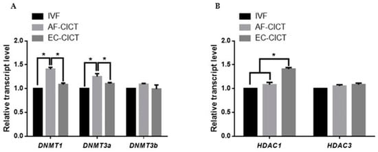 Relative mRNA expression levels of DNA methylation and histone acetylation in blastocysts determined by quantitative reverse transcription PCR. (A) Relative mRNA expression levels of DNMT1, DNMT3a, DNMT3b. (B) Relative mRNA expression of HDAC1, and HDAC3 in blastocysts from the IVF, AF-CICT, and EC-CICT groups. The data are from three independent experiments and are means ± SEM (* p < 0.05).