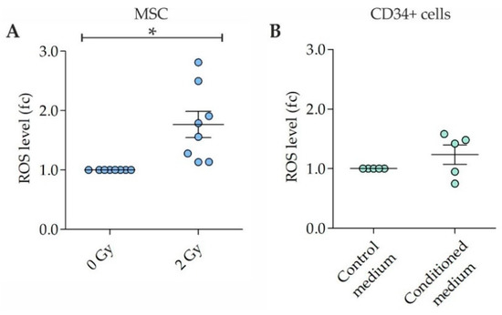 Reactive oxygen species (ROS) levels in irradiated mesenchymal stromal cells (MSC) and CD34+ cells grown in MSC conditioned medium. (A) ROS levels in 2 Gy-irradiated MSC at 4 h after irradiation. n = 8 samples. (B) ROS levels in CD34+ cells grown for 3 days in medium conditioned by 2 Gy-irradiated MSC. n = 5 samples. Data are presented as means ± SEM. fc, fold change. One sample t-tests. * p < 0.05.