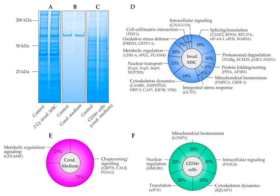 Comparative proteome analysis in mesenchymal stromal cells (MSC), MSC conditioned medium and CD34+ cells. (A) Exemplary SDS-PAGE of lysates of non-irradiated and 2 Gy-irradiated MSC, (B) control medium and medium conditioned by 2 Gy-irradiated MSC and (C) lysates of CD34+ cells grown in control medium and in medium conditioned by 2 Gy-irradiated MSC. (D) Proteome alterations in mesenchymal stromal cells (MSC) (n = 5 replicates, * 3%), (E) MSC conditioned medium (n = 4 replicates) and (F) CD34+ cells grown for 3 days in MSC conditioned medium (n = 5 replicates).