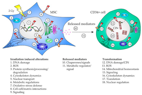 The aim of our study was to analyze NTE in human CD34+ cells and the sequence of genotoxic signaling from irradiated human MSC to CD34+ cells as a potential mechanism of MN initiation, which are termed in this context therapy-related MN (t-MN). For this purpose, NTE were analyzed in CD34+ cells grown in medium conditioned by 2 Gy-irradiated MSC. Furthermore, ROS and proteome shifts were assessed in (I) irradiated MSC, (II) MSC conditioned medium and (III) CD34+ cells exposed to MSC conditioned medium. Naturally, our data present a snap-shot in the dynamic process of the radiation response, the release of genotoxic mediators and the induction of NTE. Overall, based on radiobiological considerations, IR-induced leukemogenesis might be a function of several parameters including targeted effects, NTE, and a given HSPC predisposition specified by gene mutations interfering with processes such as genome maintenance mechanisms and the DNA damage response.