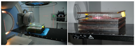 Experimental set-up for irradiation of mesenchymal stromal cells (MSC). MSC flasks were placed on 8 × 1 cm plexiglass sheets on the patient table of a Versa HD linear accelerator (Elekta). An additional 1 cm plexiglass sheet was put on top of the flasks. The laser system was used for positioning the flasks in the radiation field. All MSC in the flasks were irradiated with 2 Gy of 6 MV X-rays in orientation from top.