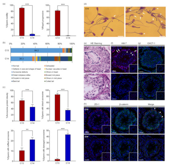 Poor sperm index of infertile C14 sperm. (a) Sperm motility and progressiveness by computer-assisted sperm analysis (CASA). Red bars indicate motility and progressiveness of C13 sperm and blue bars for C14 sperm. *** p < 0.001 vs. C13. (b) Morphological evaluation of sperm. Relative stacked bar chart shows the relative percentage of morphological parameters of sperm in head, midpiece, and tail. Each parameter is depicted in different color. Numbers in the light blue bar indicate the percentage of normal sperm in each group. (c) Morphological evaluation of sperm head. Red bars indicate structural parameters of C13 sperm head and blue bars for C14, those including acrosome stain and acrosomal intactness. ** p < 0.01, *** p < 0.001 vs. C13. (d) Representative image of sperm. Arrowheads indicate sperm with ruffled acrosomes and arrows for sperm with damaged acrosomes. Scale bar represents 20 µm. (e) Histological comparisons of testes by hematoxylin and eosin (H&E). The area containing elongating spermatid is circled with white dashed lines. (f,g) Confocal immunofluorescence (IF) microscopy of testis sections from C13 and C14. Anti-Ki67 (red) and anti-OXCT1 (green) antibodies were used. Arrows and arrowheads indicate spermatogonia and primary spermatocytes, respectively. (h) Testis was double labeled for zonula occludens 1 (red) and β-catenin (green). Arrowheads indicate co-localization of ZO-1 and β-catenin. Inserts show negative controls. Scale bar represents 50 µm.