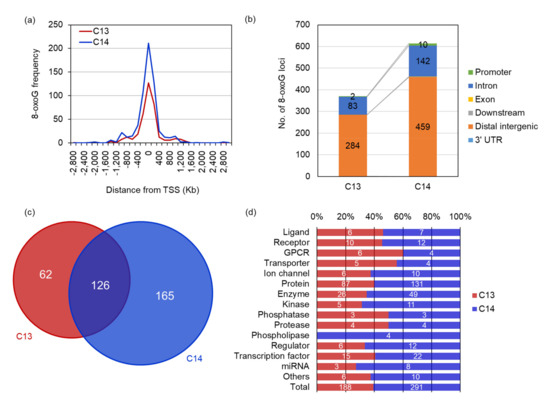 The genomic distribution analysis of the 8-oxoG loci revealed that most of them were distributed around the transcription start site (TSS) and also in the distal intergenic and intron regions. Approximately 81.6% and 82.9% of the 8-oxoG in C13 and C14 sperm DNA were distributed within TSS ± 400 Kb, respectively, and there was no difference in the 8-oxoG distribution between them (Figure 3a). The distal intergenic and intron regions had 99.2% and 97.9% of 8-oxoG, respectively, and no difference was observed between C13 and C14. However, only two promoter regions with 8-oxoG were found in C13 sperm DNA, whereas 10 promoter regions were observed in C14 sperm DNA, and the distribution of 8-oxoG in the C14 promoter regions increased by five times compared to C13 promoters (Figure 3b). Annotation of the genomic loci containing 8-oxoG showed that 188 and 291 genes harbored 8-oxoG in their genetic elements (8-oxoG genes). Among them, 126 genes were common in both C13 and C14 sperm DNA, and 62 and 165 genes were exclusively annotated in C13 and C14 sperm, respectively (Figure 3c). The annotated products encoded by 8-oxoG genes showed that various kinds of proteins had 8-oxoG in their genomic elements, including the ligand and transcription factor. In most protein classes, no frequency difference was observed between C13 and C14 sperm in the content of 8-oxoG. However, the number of 8-oxoG genes encoding kinases, phospholipase, regulators, and miRNA were more than doubled in C14 sperm compared to C13, which exceeded the total ratio of 8-oxoG genes between C13 and C14 sperm. In particular, genes encoding phospholipase was observed only in the C14 sperm (Figure 3d).