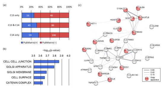 Golgi component affected by 8-oxoG in C14 sperm DNA. (a) Literature association of sperm genes containing 8-oxoG. Blue bars indicate the number of 8-oxoG genes with literature related to sperm (PubMatrix (+)) and red bars for genes without sperm-related literature (PubMatrix (−)). The number in the bar represents the number of literatures related to sperm. (b) GSEA analysis of 8-oxoG genes exclusive to C14 sperm. Horizontal axis indicates (−)log10-transformed p-value of each cellular component terminology. (c) Protein–protein interaction network analysis of functionally enriched 8-oxoG genes of C14 sperm. Nodes indicate the cellular component-enriched genes. Edge thickness indicates the interaction score. Red nodes represent the Golgi apparatus-enriched genes.