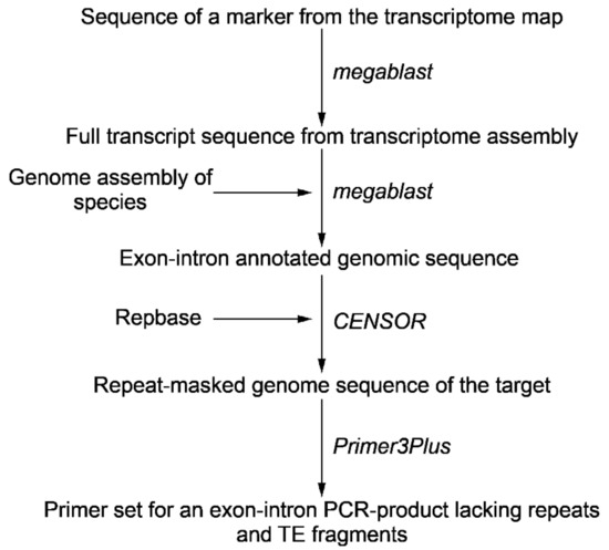 Increasing the amount of data in different databases makes it possible to design exon-intron probes without additional sequencing of target genes via primer construction and producing genomic amplicon. Advances in genome and transcriptome sequencing and assembly provide an opportunity to detect introns and exons boundaries and positions in the target gene. The presence of unique intron sequences within a transcript-based probe having conserved exon sequences increases both the specificity and the length of the target chromosomal sequences. For the design of the probe, we selected two markers from the transcriptome map assigned to chromosome 2, which were mapped at a distance on recombinant map [27]. To design an exon-intron probe we blasted Unigene572 and Unigene5305 marker sequences against TSA (Transcriptome Shotgun Assembly) databases of Allium cepa in order to find the full transcript sequences. To identify exon-exon junctions in transcript and exon-intron boundaries in the genome sequence the draft genome assembly of A. cepa was used (S. Sato and M. Shigyo, unpublished). The repetitive DNA sequences within the designed probe DNA and subsequently cloned and sequenced genomic DNA amplicons can be located precisely in draft and complete genomic sequence contigs by computational means (Figure 1). To detect fragments of probe that have identity to repeats and transposable elements (TE) target sequence was annotated using CENSOR [28]. Information about coordinates and lengths of introns and fragments of repeats and TEs was used to design primers and obtain an exon-intron PCR-product (Table 1). The exon-intron PCR-products were cloned and sequenced (File 1 S1).