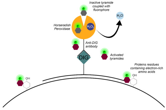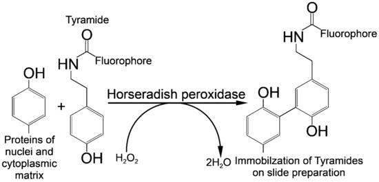 The principle of labeled tyramide deposition is via free radical formation, and reaction with electron-rich moieties such as tyrosine, tryptophane, etc. [32]. HRP, in the presence of low concentrations of H2O2, converts tyramides into an oxidized form with highly reactive free radicals [33]. These activated tyramides then covalently bind to tyrosine or other nuclear and cytoplasmic protein residues on the slide in close proximity to the HRP, thus, depositing many of the labeled tyramides (Figure 5).