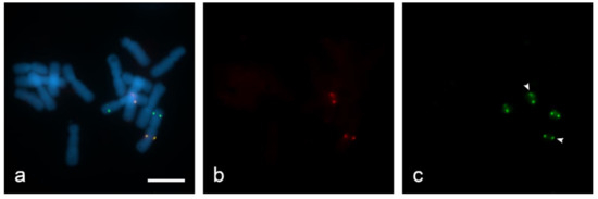 Evaluation of quenching of horseradish peroxidase (HRP) in dual-color sequential Tyr-FISH “SteamDrop” slide. Quenching with 0.3% H2O2 for 30 min: (a) visualization of two probes—merged image; (b) visualization of Unigene572 detected with tyramide-Cy3 using Cy3-filter (red); (c) visualization of Unigene5305 detected with Tyr-FITC using FITC-filter (green), arrows indicate signals arising from Unigene572 because HRP activity after the first detection step was not quenched. Scale bar—10 µm.