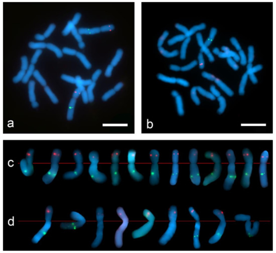 Dual-color Tyr-FISH on mitotic metaphase chromosomes of Allium cepa probing with Unigene572 (red) and Unigene5305 (green): (a) “SteamDrop” chromosome preparation; (b) squashed chromosome preparation; (c) extracted chromosome 2 from metaphases of “SteamDrop” chromosome preparations; (d) extracted chromosome 2 from metaphases of squashed chromosome preparation. Scale bar—10 µm.