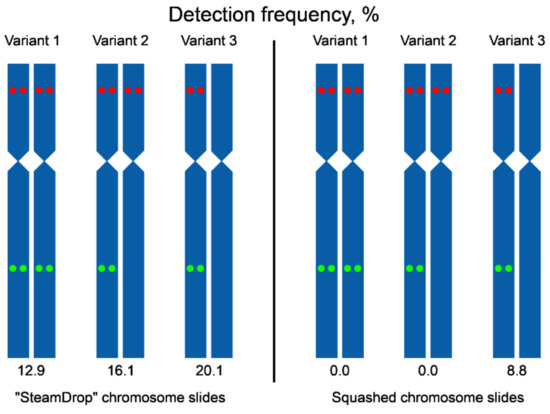 We have also analyzed the frequency of detecting signals from two probes together per metaphase (Figure 8). In “SteamDrop” preparations, signals arising from two probes on the chromosomes of both homologs within the same metaphase were detected in 12.9% of metaphases and in the case of squashed chromosome preparations, such metaphases were not found. Metaphases with signals from both probes on one homologous chromosome accounted for 36.1% (combined variants 1 and 2, Figure 8) for “SteamDrop” preparations and 8.8% for squashed preparations.