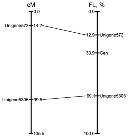 The genetic positions of the markers were anchored with their position on the chromosome 2. The physical position of the markers was expressed as a percentage of fractional length (FL) from the end of the short arm of chromosome 2 and corresponded with their position in the genetic map (Figure 9).