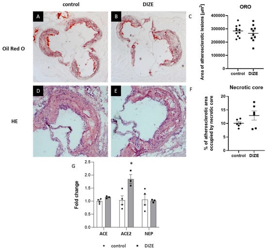 Influence of DIZE on atherosclerosis progression. Representative micrographs showing oil-red O-stained atherosclerotic lesions (A,B) and HE-stained necrotic cores (D,E) in the aorta of control and DIZE-treated mice as well as their corresponding quantitative analyses (C,F). mRNA expression of ACE, ACE2, and NEP in the aorta of control and DIZE-treated mice (G). Data are mean ± SEM analyzed using t-test (* p < 0.05 as compared to control; n = 3–11 per group).
