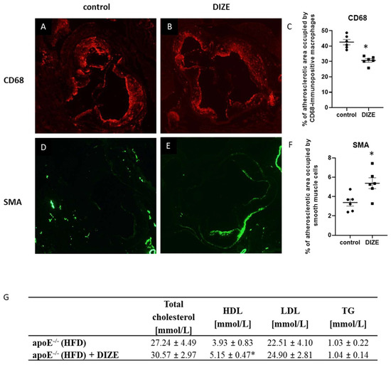 Impact of DIZE on the stability of atherosclerotic plaques. Immunohistochemical staining of aortic roots showing CD68-positive macrophages (A,B) and smooth muscle α-actin (SMA) (D,E) in control and DIZE-treated mice. Quantitative analysis of the atherosclerotic lesions area occupied by CD68-positive macrophages (C) and smooth muscle cells (F). The plasma levels of total cholesterol, high-density lipoproteins (HDL), low-density lipoproteins (LDL), and triglycerides (TG) (G) in control and DIZE-treated mice. Data are mean ± SEM analyzed using t-test (* p < 0.05 as compared to control mice; n = 4 or 6 per group).