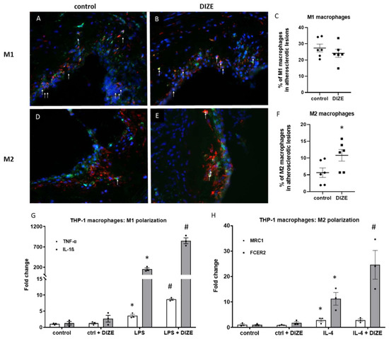 Macrophages polarization in atherosclerotic lesions and THP-1 cell culture after treatment with DIZE. Representative immunohistochemical staining of aortic roots showing F4/80 (green), nitric oxide synthase 2 (iNOS)/arginase 1 (red), and 4′6-diamidino-2-phenylindole (DAPI) (blue) co-localization in control (A,D) and DIZE-treated mice (B,E). White arrows indicate M1 (A,B) and M2 (D,E) macrophages, respectively. Quantitative analysis of M1 and M2 contents in the atherosclerotic plaques (C,F). mRNA expression of M1 (IL-1β and TNF-α) (G) and M2 (MRC1, FCER2) (H) markers in THP-1 macrophages cell culture polarized to proinflammatory M1 and anti-inflammatory M2 phenotype after treatment with DIZE. Data are mean ± SEM analyzed using t-test (C,F) or one-way ANOVA with multiple comparisons and Benjamini and Hochberg false discovery rate (FDR) correction (G,H) (* p < 0.05 as compared to control; # p < 0.05 as compared to LPS or IL-4, respectively; n = 3 independent experiments or n = 6 biological replicates per group).