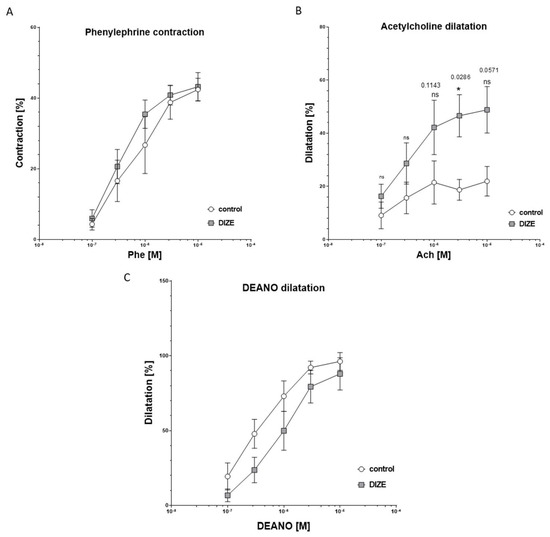 Graphs showing the time course response of mesenteric arteries to phenylephrine (A), acetylcholine (B), and DEA-NO (C) from control and DIZE-treated mice. Data are mean ± SEM analyzed using nonparametric Mann–Whitney U test (* p < 0.05 as compared to control mice; n = 4–6 per group).