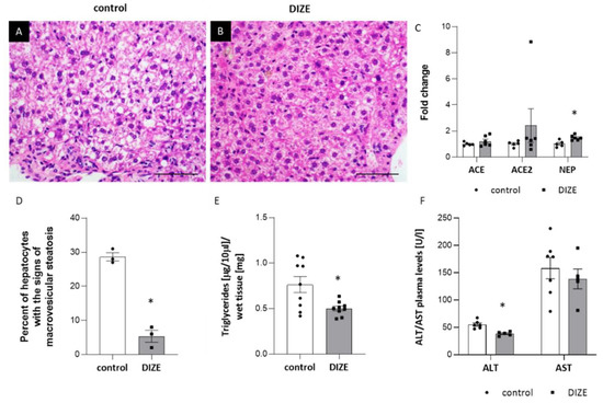 Influence of DIZE on the development of hepatic steatosis. Representative images of livers in con-trol (A) and DIZE-treated mice (B). The figures show hematoxilin and eosin staining (A,B) and quantitative analysis of macrovesicular steatosis (D), triglycerides content in the liver (E) as well as plasma ALT/AST levels (F) in control and DIZE-treated mice. mRNA expression of ACE, ACE2 and NEP in the liver of control and DIZE-treated mice (C) Magnification 40×. Data are mean ± SEM analyzed by using t-test (* p < 0.05 as compared to control mice; n = 3–9 per group).