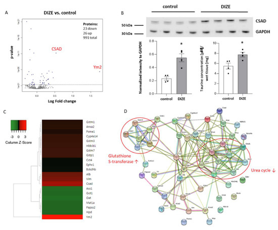 Proteomic analysis in the liver of DIZE-treated mice. The volcano plot of differentially expressed proteins showing the log2 fold change of protein expression vs. p-value in DIZE group compared to control mice (A). Validation of cysteine sulfinic acid decarboxylase (CSAD) expression by Western blot as well as the taurine levels in the liver of DIZE-treated mice (B). Heat map presentation of a hierarchical cluster of significantly changed proteins in the liver of DIZE-treated mice (C) (fold change >1.15 and <−1.15). Bioinformatic analysis by STRING of differentially expressed proteins reveals decreased expression of urea cycle proteins and increased expression of different isoforms of glutathione S-transferase (D). Data are mean ± SEM analyzed using t-test (B) or one-way ANOVA with Benjamini and Hochberg false discovery rate (FDR) correction (A,C) (* p < 0.05 as compared to control mice; n = 4 per group).