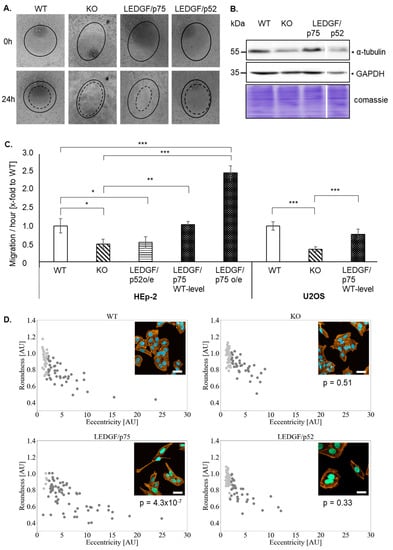 LEDGF has been previously shown to affect cell migration. Therefore, the cell migration of HEp-2 and U2OS cells was checked. Indeed, the migratory capacity was significantly reduced upon LEDGF knockout in HEp-2 and U2OS cells (Figure 2). LEDGF/p52 re-expression failed to restore the migration capacity of the HEp-2 WT (Figure 2A,C). In contrast, LEDGF/p75 re-expression (WT level) reversed the inhibiting effect, and the cell migration ability was further improved with higher LEDGF/p75 levels (oe) in comparison to the unmodified WT cells (Figure 2C and Figure S4). Additionally, EGFP-LEDGF/p75 o/e cells showed a changed morphology toward an elongated, fibroblast-like phenotype in combination (Figure 2D) with an increased expression of the cytoskeleton subunit α-tubulin (Figure 2B). Morphological analysis revealed that LEDGF/p75 o/e cells exhibited a significantly increased eccentricity and a significantly decreased round shape by 50% (p < 0.05, Figure 2D). However, LEDGF KO cells showed a reduced expression of α-tubulin but no change in morphology (Figure 2B).