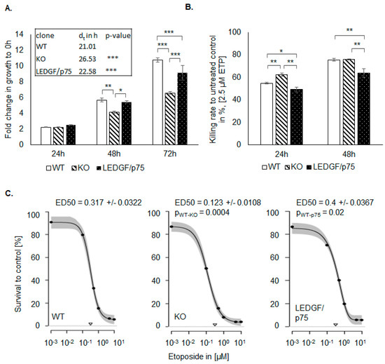 LEDGF affects cell proliferation and chemoresistance. (A) Proliferation of non-treated HEp-2 WT (passage 15–23), LEDGF KO (passage 6–13), and LEDGF/p75 re-expressing (passage 5–12) was determined for 0 h, 24 h, 48 h (pWT-KO = 0.006, pKO-p75 = 0.015, pp75-WT = 0.705), and 72 h (pWT-KO = 3 × 10−6, pKO-p75 = 7 × 10−5, pp75-WT = 0.03) by SRB assay. Doubling time (dt) was determined for the HEp-2 WT, LEDGF KO, and LEDGF/p75 re-expressing cell line (pWT-KO = 3.4 × 10−5, pp75-KO = 2.6 × 10−4). (B) After 24 h growth, indicated cell lines were treated with 1.25 µM etoposide for 24 h (pWT-KO = 0.010, pKO-p75 = 0.0004, pp75-WT = 0.022) and 48 h (pWT-KO = 0.044, pKO-p75 = 0.0002, pp75-WT = 0.0021), and the survival rate was determined in comparison to the untreated control. (C) Determination of ED50 value of HEp-2 WT, LEDGF KO, and LEDGF/p75 o/e cells after 48 h etoposide treatment, followed by 3 days of recovery. Dose–response curves were fitted (95% confidence interval) with multiparametric functions (EXD3: Three-parameter exponential decay model; LL4: Four-parameter log-logistic model, pWT-KO = 0.0004, pWT-p75 = 0.02). The triangles on the x-axis represent the dose of etoposide needed to reach ED50. * p < 0.05, ** p < 0.01, *** p < 0.001.