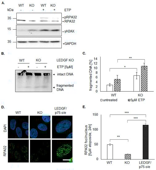 LEDGF knockout in HEp-2 cells caused a significant increase in sensitivity toward etoposide shown by a higher killing rate (Figure 3B). This phenotype was underlined by phosphorylation of H2AX (γH2AX, Figure 4) and an increased level of DNA fragmentation (Figure 4B) indicating etoposide-induced DSBs; however, it was similar to wild-type HEp-2 cells. In contrast, the phosphorylation of RPA32 (pRPA upper band in Figure 4A after etoposide treatment) was almost completely abolished in LEDGF KO cells, while wild-type cells showed an elevated phosphorylation level. This was also reflected in significantly reduced RPA32 foci formation (Figure 4D,E) after etoposide treatment in LEDGF KO cells, indicating an inhibition of CtIP-BRCA1-mediated homology-directed repair. The re-expression of LEDGF/p75 was able to rescue the RPA32 foci formation (Figure 4D,E).