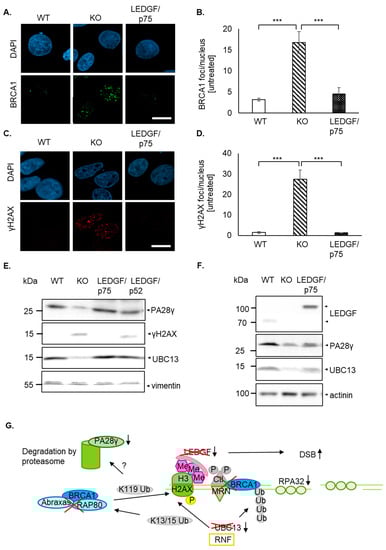 Since the persistent DNA fragmentation in LEDGF KO cells still allows proliferation, we investigated whether the persistently high γH2AX could be also related to an insufficient degradation of the γH2AX. An efficient and coordinated degradation of signaling molecules is necessary for an efficient DDR, which is also accompanied by a vast amount of proteasome-independent K63-linked ubiquitin modifications of the signaling molecules. The protein ubiquitylation plays a central role orchestrating the DDR, whereby K63 linkages promote protein recruiting and K48 linkages destabilize the protein (degradation) [39]. At the end of the signal transduction, many DDR-involved molecules e.g., γH2AX, are degraded by the proteasome [16,40,41]. Interestingly, it has been shown that the knockout of the nuclear proteasome activator PA28γ led to persistent γH2AX foci, even after signal termination [20]. These persistent γH2AX foci interfere with new DNA damage signals, which lead to an overall reduced DDR and thus to genetically unstable cells. Consequently, LEDGF-depleted cells were investigated for their PA28γ expression, and indeed, PA28γ protein levels were decreased. As demonstrated for PA28γ knockout cells, LEDGF depletion also resulted in a decreased PA28γ protein level. This might indicate that the sustained γH2AX foci and BRCA1 foci are also a result of the diminished degradation of these molecules. Moreover, the proteasome recycles ubiquitin by degrading proteins, which is required indirectly for the ubiquitin signaling in DDR, as it supplies the DNA repair ligases e.g., UBC13 with ubiquitin [42]. However, an effect of limited ubiquitin is very speculative and has been investigated in this study. Nonetheless, UBC13 has been previously suggested to ubiquitinate γH2AX molecules, which subsequently allows the binding of BRCA1 to initiate the degradation of γH2AX [43]. Therefore, the UBC13 expression was also verified in the LEDGF KO cells and as expected UBC13 protein levels were abrogated (Figure 5). A possible scenario how the LEDGF KO affects the HR-mediated DDR was illustrated in Figure 5G.