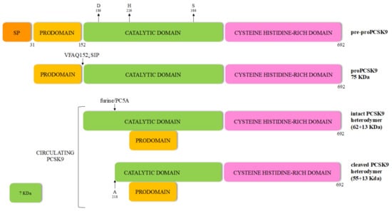 - Benjannet, S.; Rhainds, D.; Hamelin, J.; Nassoury, N.; Seidah, N.G. The Proprotein Convertase (PC) PCSK9 Is Inactivated by Furin and/or PC5/6A: Functional Consequences of Natural Mutations and Post-Translational Modifications. J. Biol. Chem. 2006, 281, 30561–30572. [Google Scholar] [CrossRef]