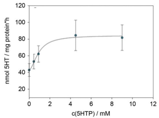 Protein expression of aromatic amino acid decarboxylase (AADC) was tested by the capability of cellular lysate to react to 5-HTP provided in excess to serotonin. This experiment showed a rise in the determined serotonin with increasing 5-HTP concentrations (Figure 1). From this graph, a Lineweaver–Burk plot was derived, which led to a value of 0.28 mM for Km and 85 nmol mg protein-1 h-1 for vmax.