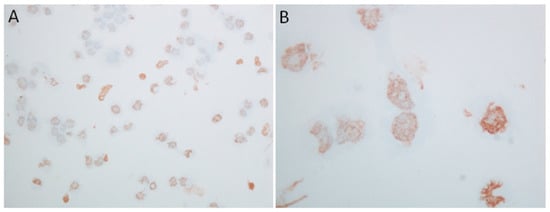 In a second set of experiments, HGT-1 cells were seeded into either DMEM or DMEM containing 100 µM PCPA. In both cases, positive serotonin staining was observed (Figure S3). However, cells that received PCPA at seeding exhibited less pronounced serotonin staining (Figure S3E). After image analysis with Image J, a fold-change of 0.73 was calculated, indicating a reduction in serotonin staining by 27% in the p-chlorophenylalanine (PCPA) treated group. In the absence of a blocking peptide, the primary anti-5-HT antibody was pre-incubated with pure serotonin for 30 min prior to the incubation. In this experiment, control cells receiving the pre-blocked version of the antibody showed a mean reduction in serotonin staining by 23%, suggesting that part of the antibody was prevented from binding to cellular serotonin by the pre-incubation. Figure 3 shows characteristic staining for serotonin in human benign and carcinoma stomach samples with positivity in scattered single cells.